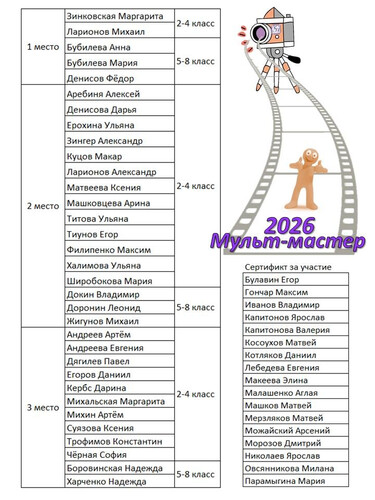 Работы Победителей отборочного этапа, занявшие 1 место, отправлены на отборочный тур Всероссийского конкурса «Мульт-мастер», проводимого в рамках Открытого Всероссийского фестиваля технического творчества «ТехноКакТУС: как творить, уметь, созидать». Пожелаем им удачи и высоких оценок жюри!
